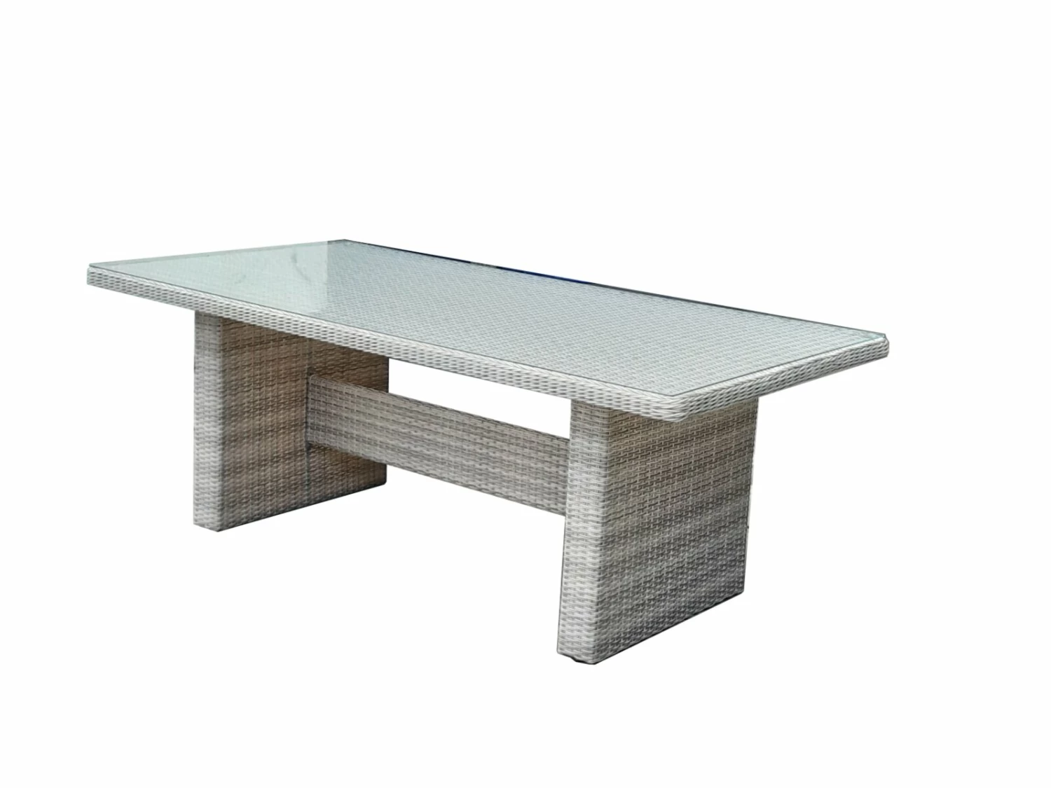 An diesem etwa 200 Zentimeter breiten Gartentisch DIJON können acht Personen Platz nehmen und tolle Grillabende genießen. Ein Gestell aus Aluminium und das graue Geflecht sorgen für Stabilität und einen festen Stand. Auf dem Gestell befindet sich eine etwa fünf Millimeter starke Sicherheitsglasplatte, die leicht zu reinigen ist.