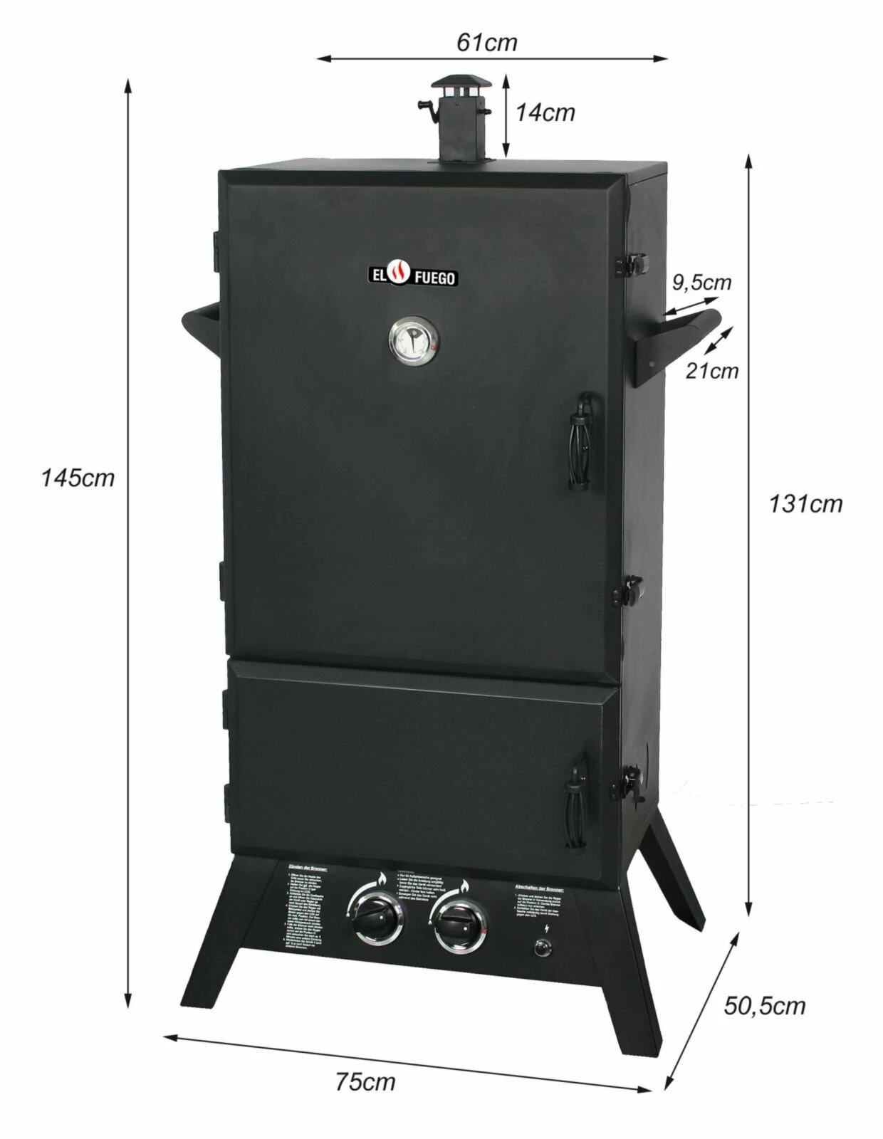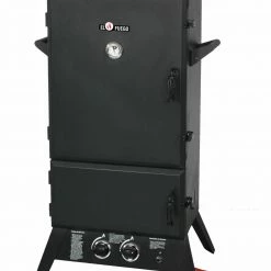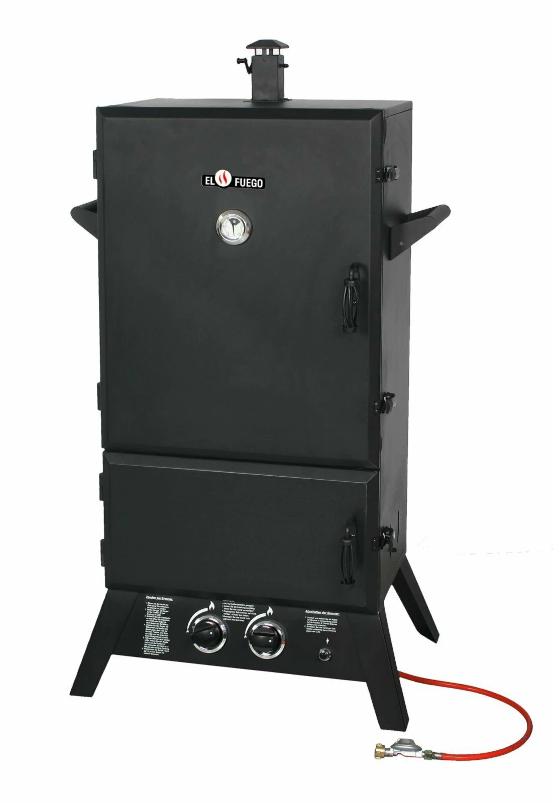 Dieser Smoker wird mit Gas betrieben, so dass er immer schnell auf Betriebstemperatur ist. Die Kassette für Räucherchips kann entnommen und leicht befüllt werden. Darüber liegt eine große Wasserschale für lange Garprozesse. Der Kamin kann zudem reguliert werden, so dass auch darüber die Temperatur steuerbar ist. Auf bis zu sechs Grillrosten können Sie Räuchern, Dampfgaren, Backen und Grillen. Da bleibt nur zu sagen: viel Spaß und guten Hunger!