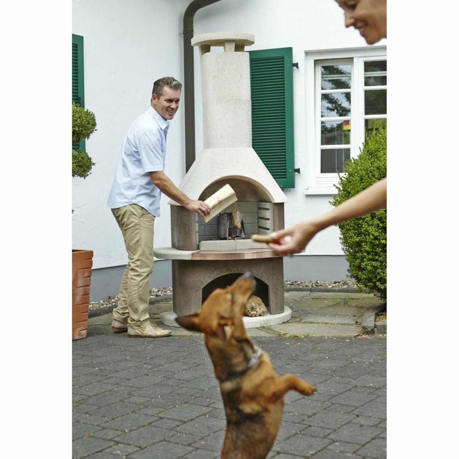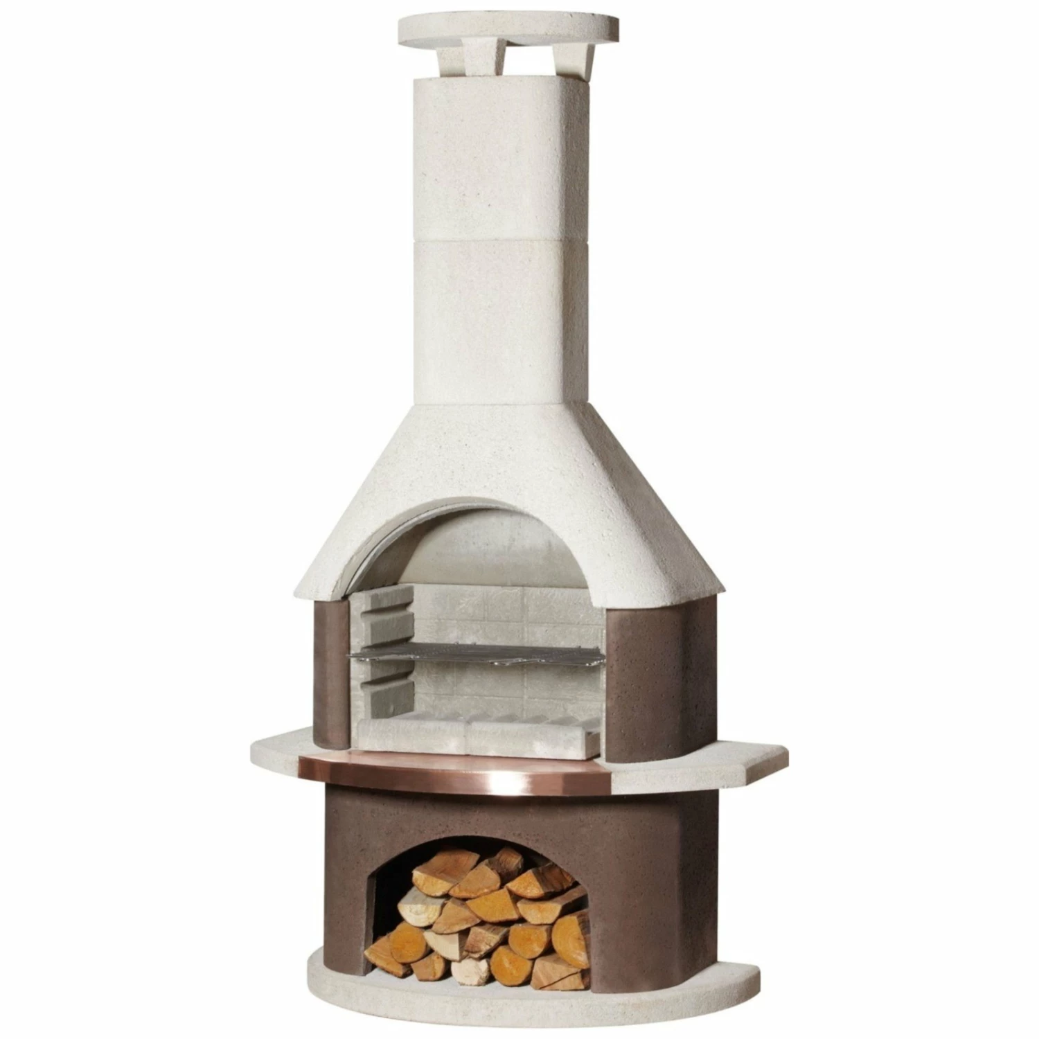 Der weiß-braune Grillkamin SAN REMO ist mit einer eindrucksvollen Kupferblende vor der Feuerstelle ausgestattet. Diese verleiht dem Grill eine besondere Note. Das untere Fach bietet reichlich Lagerfläche für Ihre Holzkohle und auf der 54 x 34 Zentimeter großen Grillfläche finden Fleisch und Co. mehr als genügend Platz.