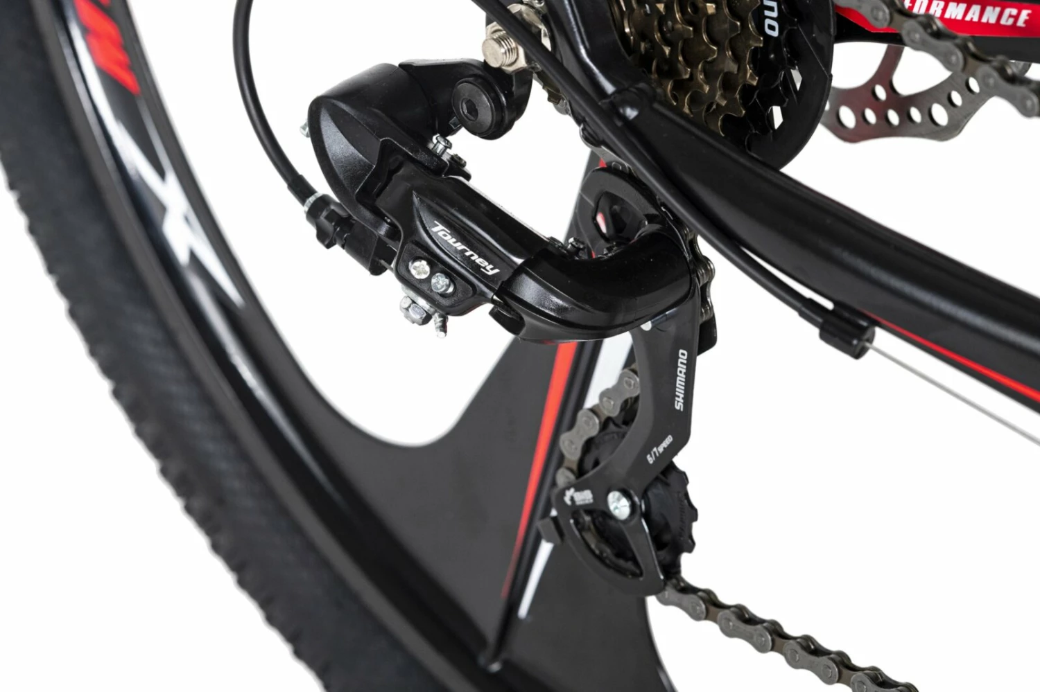Das 29″ Mountainbike überzeugt mit super Ausstattung und trendigem Design. Der etwa 48 cm hohe schwarze Rahmen kombiniert mit roten Details ist ein echter Hingucker. Das absolute Highlight sind die Magnesium-Aluminium-Laufräder mit einzigartiger Optik. Das Mountainbike ist mit einer 21-Gang-Schaltung von SHIMANO ausgestattet. Die mechanischen Wave-Scheibenbremsen sorgen für gute Verzögerung.