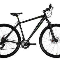 Das HEIST-Mountainbike von KS Cycling überzeugt mit schwarzem Rahmen, sowie den dezent farbigen Akzenten. Das 29″-Bike punktet mit mehr Traktion durch die große Aufstandsfläche und durch das hohe Tretlager wird die Gefahr des Aufsetzens der Kettenblätter im Gelände verringert. In der 29“-Ausstattung sorgt es für ein besonderes Fahrgefühl und läuft etwas ruhiger als beispielsweise die Modelle mit 26“.Der Rahmen weist eine Höhe von etwa 51 cm und ist aus Stahl gefertigt. Ausgestattet ist das Fahrrad mit einer 21-Gang-Schaltung von SHIMANO und mechanischen Scheibenbremsen.