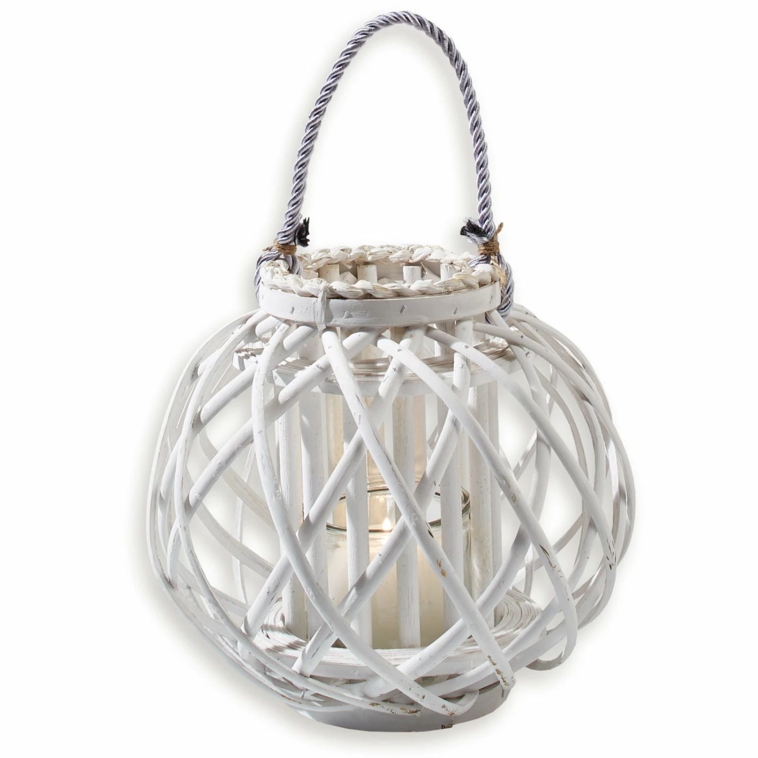 Egal ob für Ihren Wohnraum oder Außenbereich, mit dieser weißen und aus Rattanholz gefertigten Laterne werden Sie ein romantisches Ambiente versprühen. Sie verfügt über einen Durchmesser von etwa 30 Zentimetern und im Glas in der Mitte können Sie eine Kerze platzieren.