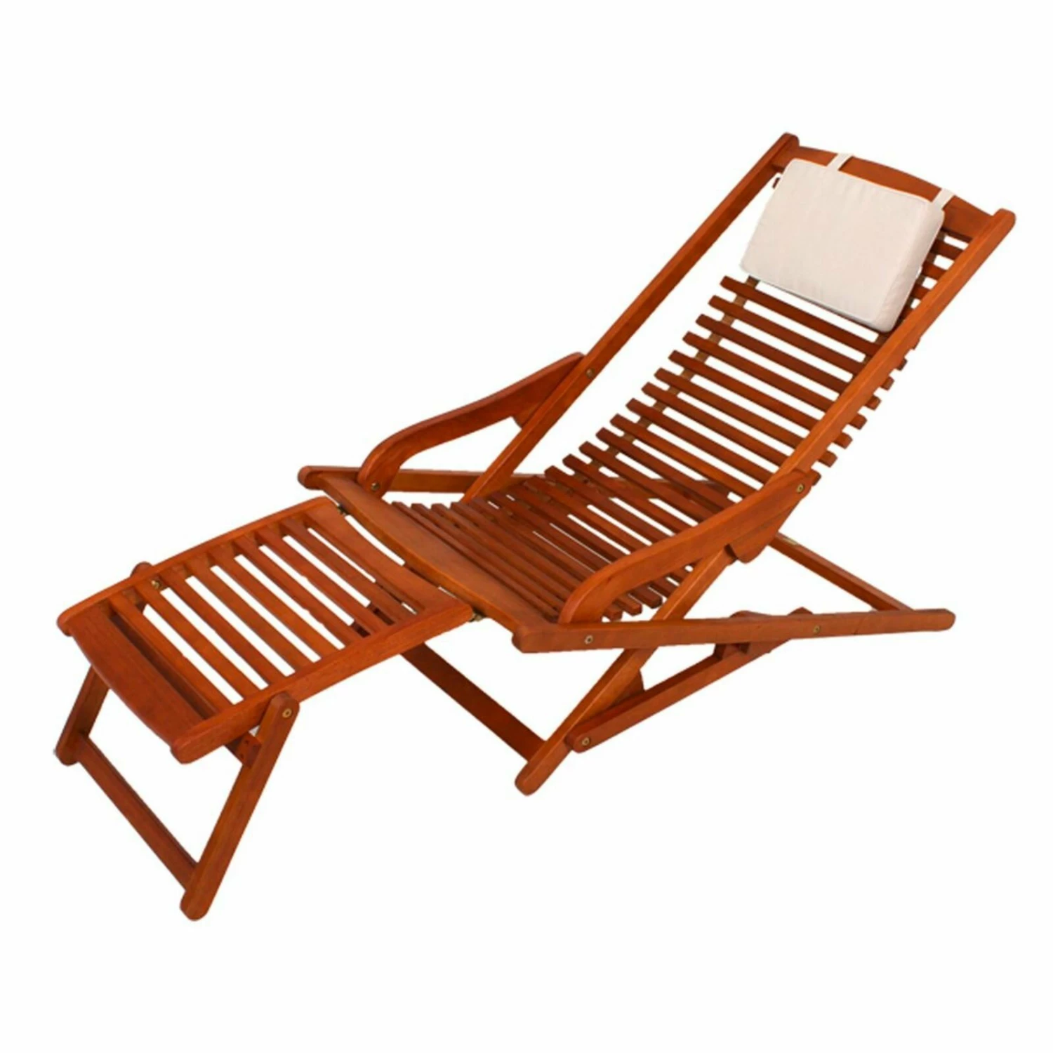 Klappbarer Viplounger aus geöltem, Eukalyptusholz. Mit cremefarbigem Nackenkissen und abnehnbarem Fußteil. So können Sie herrlich Sonnenbaden und bei Bedarf auch das Fußteil abnehmen.