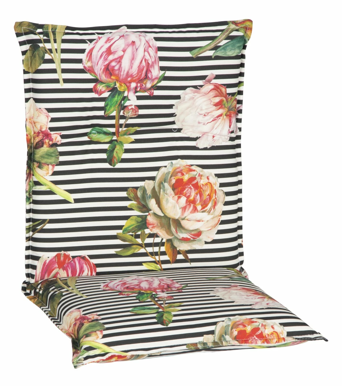 Mit ihrem fröhlichem Blumen-Muster auf schwarz-weißen Streifen macht die Niedriglehner-Auflage sonnige Tage im Garten, auf der Terrasse oder dem Balkon noch schöner. Auf dem angenehmen, hautfreundlichen und lichtechten Stoff sitzen Sie besonders gemütlich.