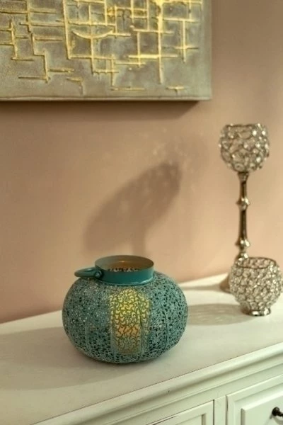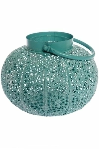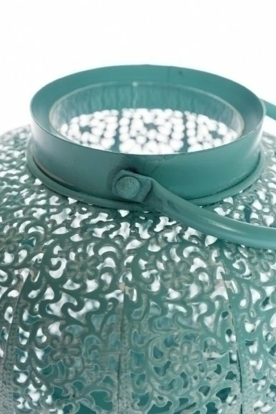 Wunderschöne Orient-Laterne in Pastellblau. Die runde Laterne ist gestanzt und schöne Ornamente zieren die ganze Laterne. Im Inneren befindet sich ein herausnehmbarer Glaseinsatz für das Teelicht. Die Maße betragen etwa