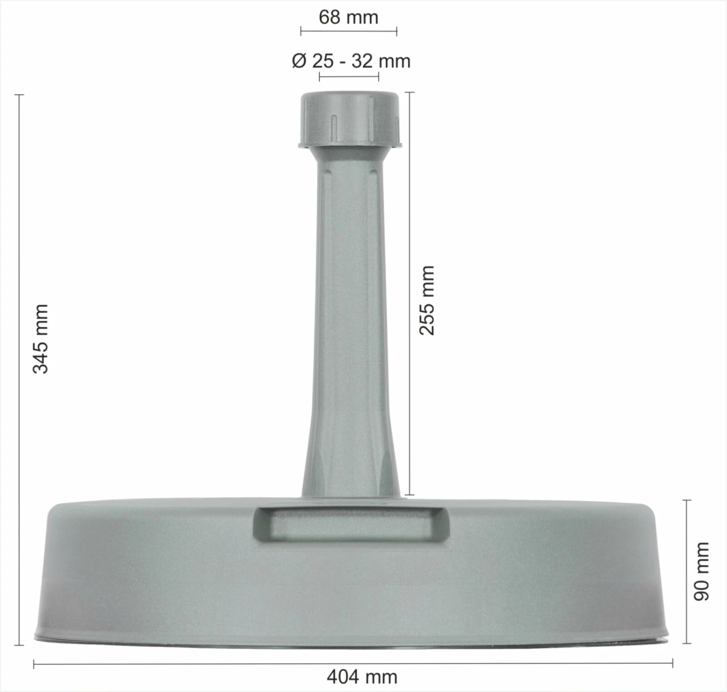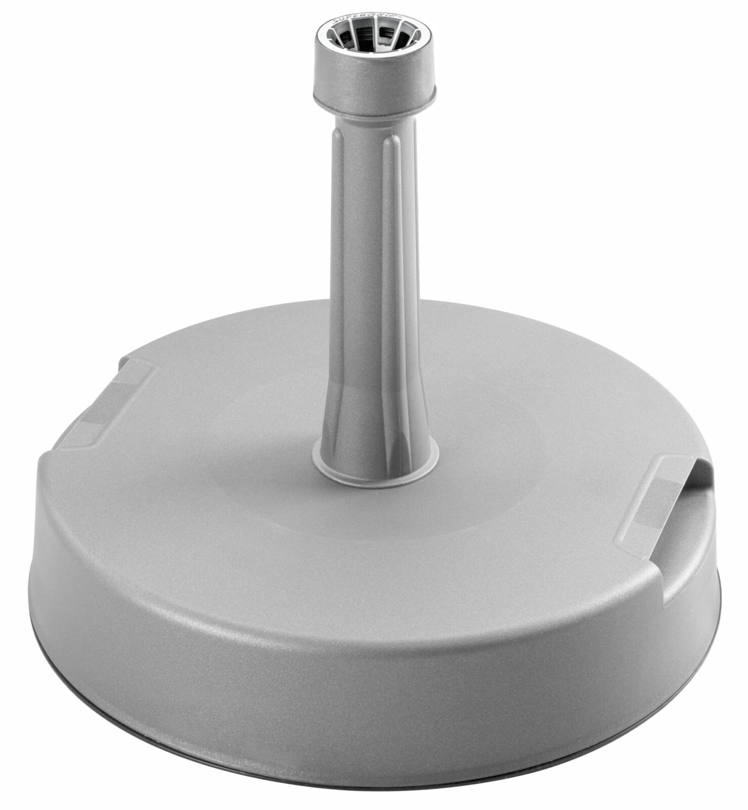 Mit schwerem Beton gefüllt, sorgt der silbergraue Schirmständer für einen guten Halt Ihres Sonnenschirmes. Rund 18,5 Kilogramm Masse im Inneren des attraktiven Kunststoffgehäuses stabilisieren Ihren Schattenspender. Der Ständer eignet sich für Stöcke mit einem Durchmesser von ca. 25 bis 32 Millimeter.