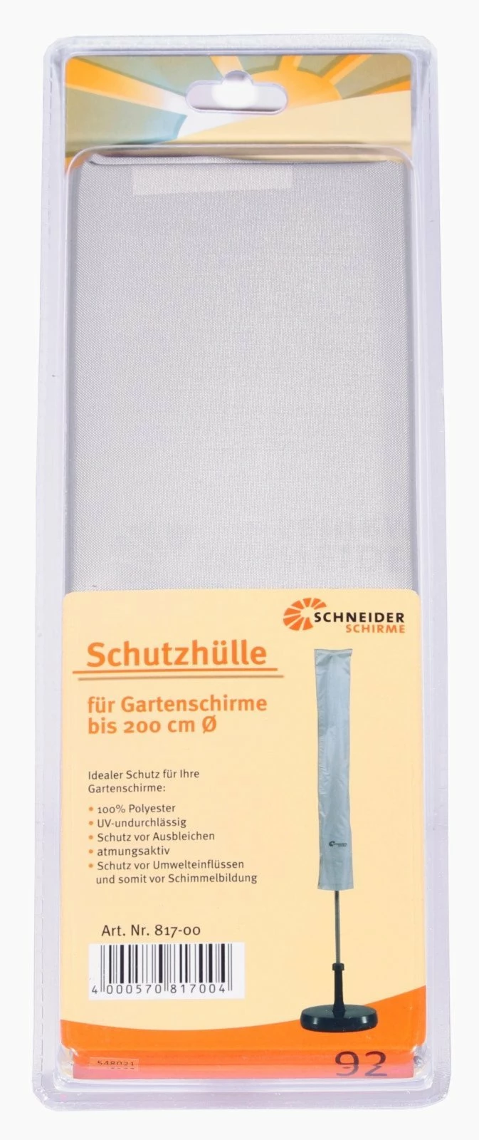 Diese Schutzhülle bis 200 cm ist lichtundurchlässig und bietet somit optimalen Schutz vor UV-Strahlung. Außerdem ist Sie atmungsaktiv und schützt den Schirm durch seine wasserabstoßende Beschichtung vor der Witterung.