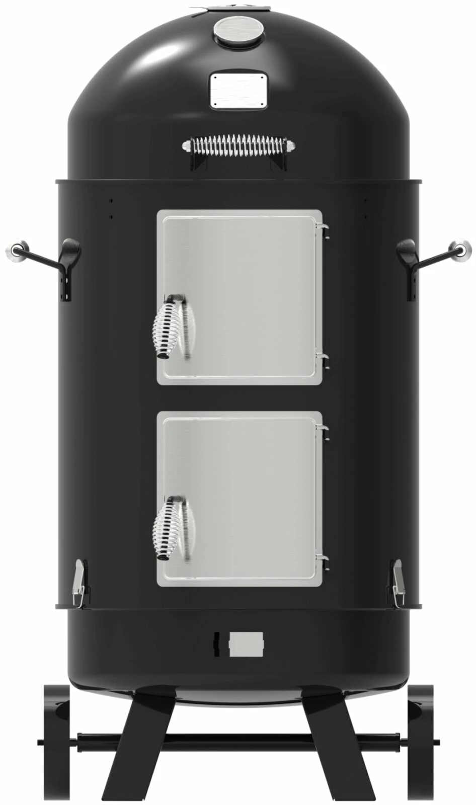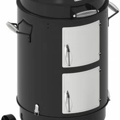 In diesem Grill, der aussieht, wie R2D2 von einem anderen Stern, bietet Ihnen die Möglichkeit viel Fleisch über einen langen Zeitraum zu garen. Das Fassungsvermögen liegt bei ca. 9 Kilogramm, so ist eine vollbesetzte Grillkammer kein Problem und die Temperatur kann lange Zeit gut gehalten werden. Die drei Roste sind emailliert und können über die beiden Klappen und den Deckel gut erreicht werden. Dank der großen Räder ist er leicht an jeden Ort zu bringen.