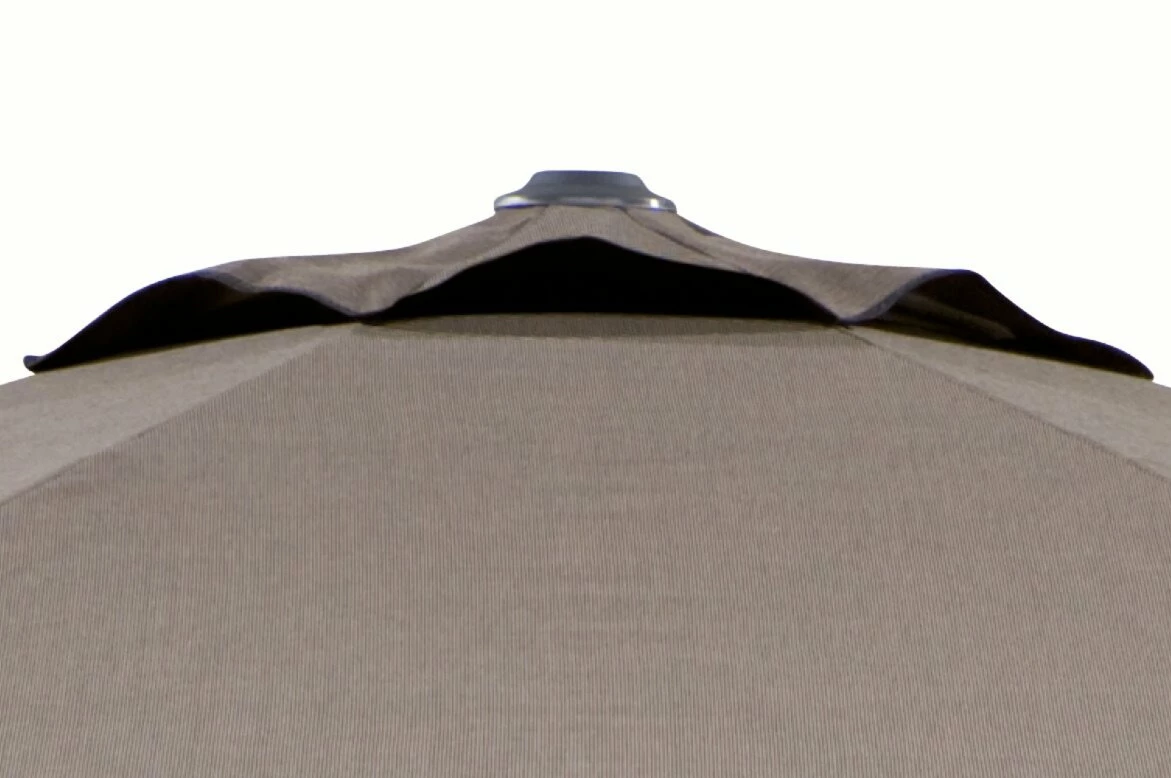Brauner Sonnenschirm KORSIKA mit integrierter Kurbel, damit Sie ihn ohne großen Kraftaufwand öffnen und schließen können. Ein besonderes Merkmal ist die interessante Weboptik des Schirms, die diesen Sonnenschutz zum echten Hingucker macht. Der air-vent sorgt für das Entweichen der warmen Luft, damit diese sich nicht unter dem Schirm staut.