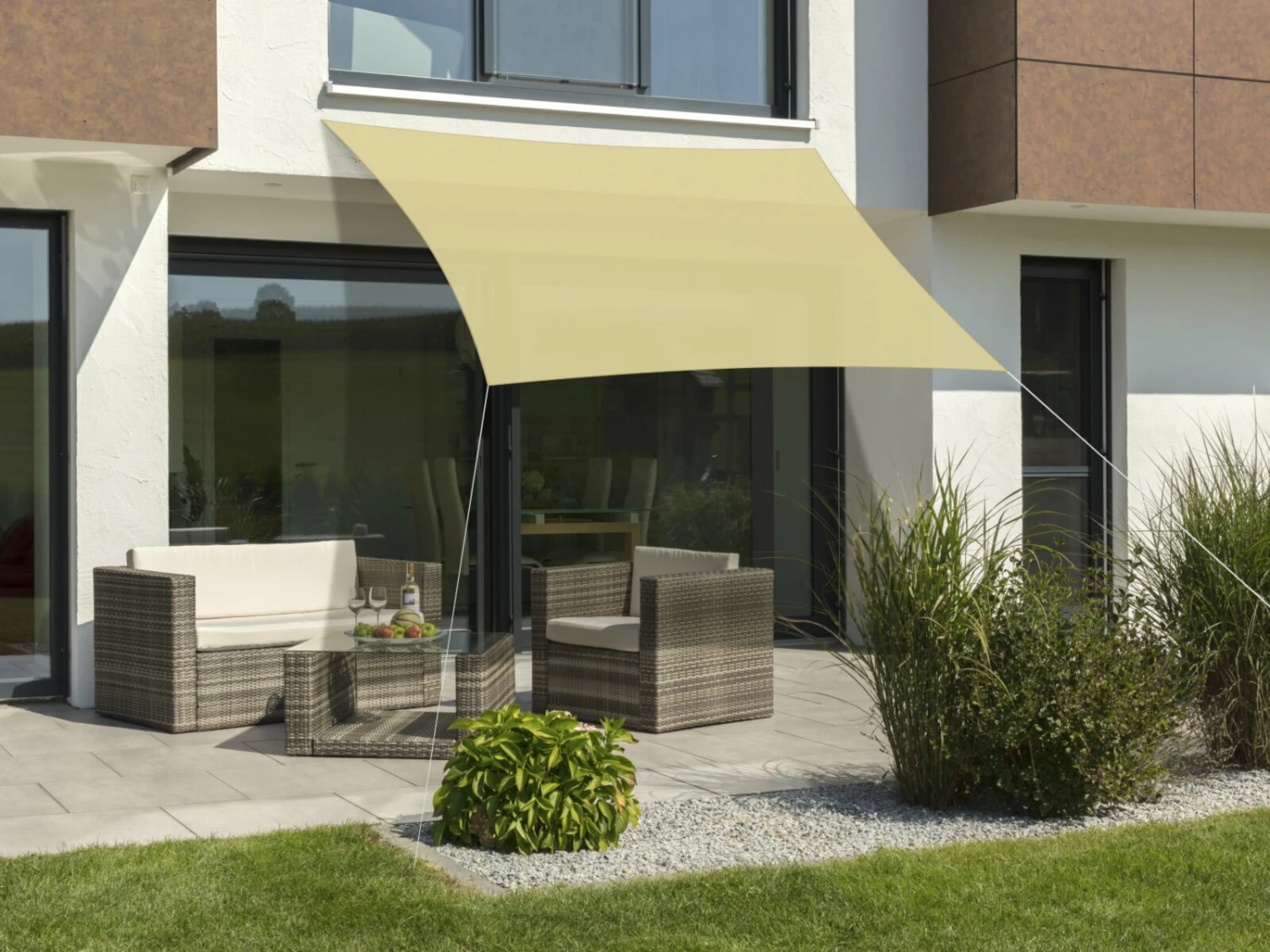 Genießen Sie die Natur unter diesem Sonnensegel in schilf. Die viereckige Form bietet Ihnen ausreichend Schatten für Sie und Ihre Liebsten. Das Segel aus Polyester schützt Sie zudem vor UV-Strahlung. Die Aufbewahrung im Freien stellt kein Problem dar, da der Stoff wasserabweisend imprägniert und verrottungsfest ist. Mit den im Lieferumfang enthaltenen vier Gummispannern mit Karabinerhaken und dem 10 Meter langen Befestigungsseil können Sie das Segel ideal nach Belieben platzieren und befestigen.