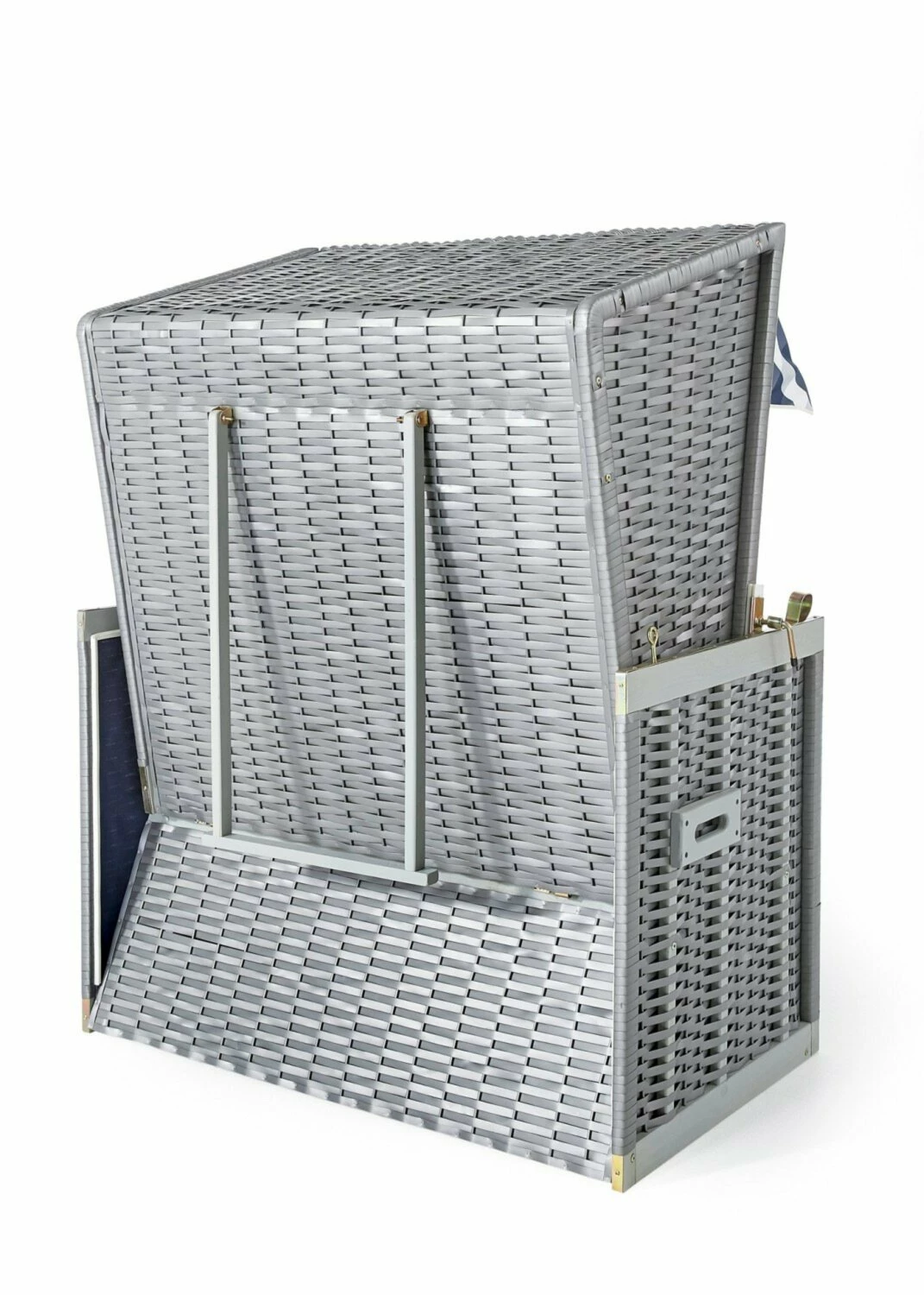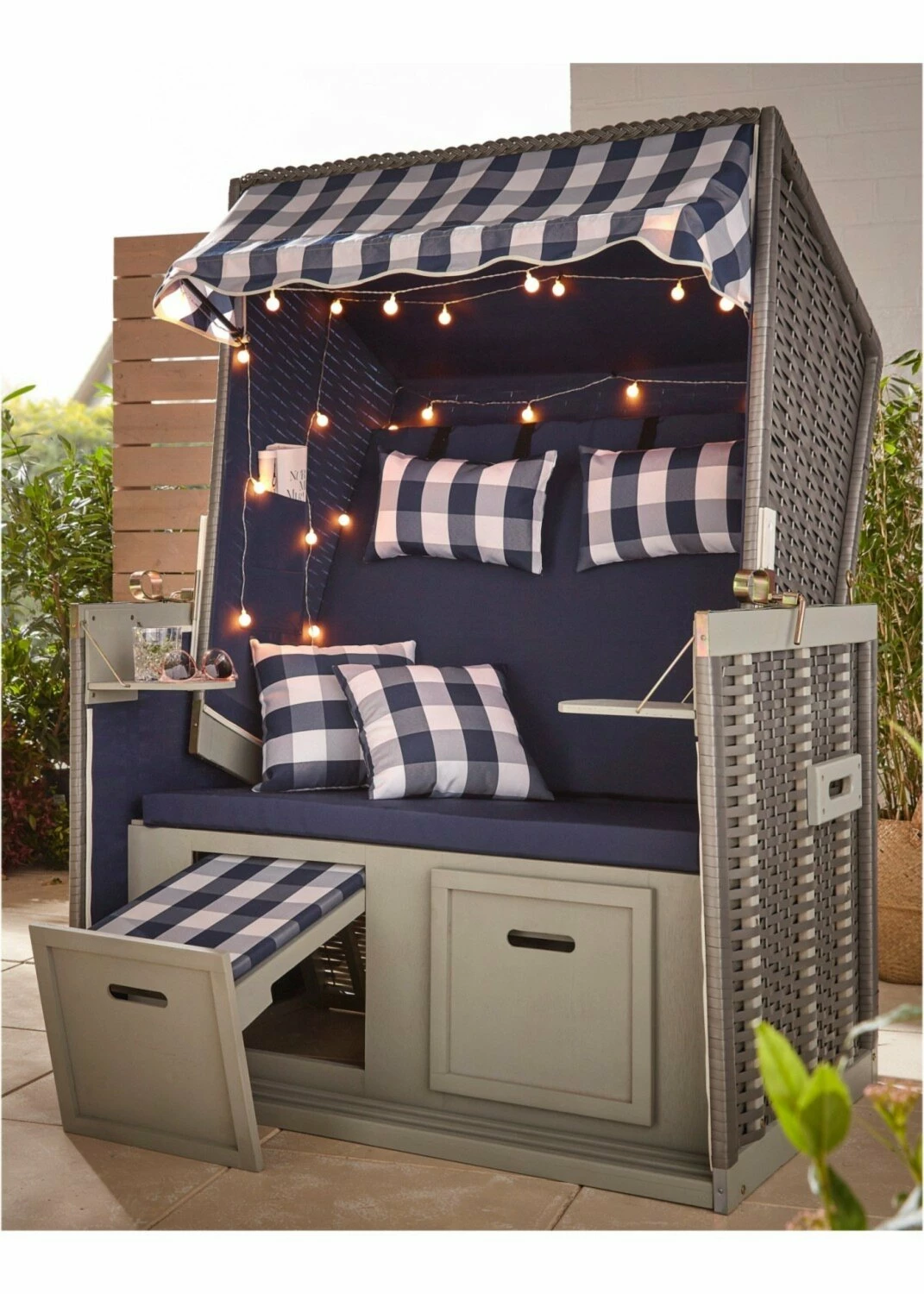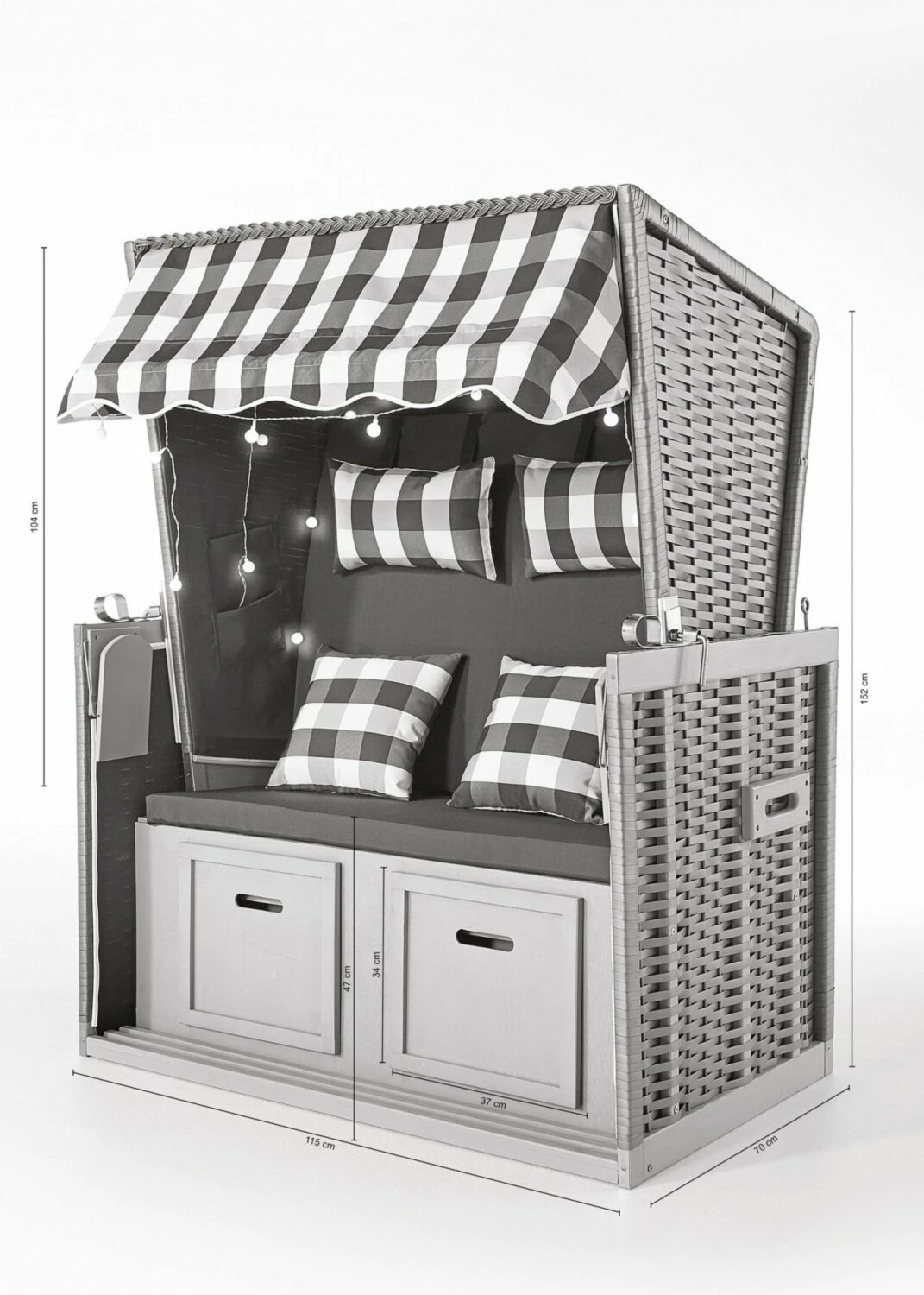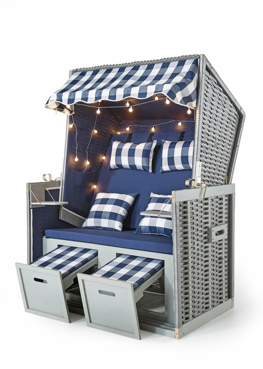 Mit diesem Strandkorb holen Sie sich das Urlaubsfeeling in Ihren Garten! Erschaffen Sie sich eine kleine Wohlfühloase und lehnen Sie sich entspannt zurück um von dem Alltagsstress zu entkommen. Der Strandkorb ist mit zwei Fußbänken ausgestattet, damit Sie Ihre Füße entspannt hochlegen können. Zudem lassen sich Getränke auf den ausklappbaren Tischen abstellen. Aber nicht nur die Ausstattung überzeugt, sondern auch das moderne Design. Das Geflecht und der Korb des Strandkorbs sind in Grau und der Stoff in Blau-Weiß gehalten. Er wird durch die LED-Beleuchtung das neue Highlight in Ihrem Garten.