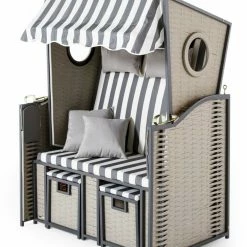 Mit diesem 1-Sitzer Strandkorb holen Sie sich das Urlaubs- und Strandfeeling in Ihren Garten oder auf den Balkon. Der graue Korb aus Spießtanne ist mit einem hellgrauen Geflecht aus Polyethylen übersehen. Abgerundet wir das Design durch den grau und weiß gestreiften Stoff im Inneren. Für ein hohes Maß an Gemütlichkeit sorgen die beiden Fußstützen, damit Sie Ihre Beine ganz entspannt hochlegen können. Durch den verstellbaren Oberkorb können Sie die Sitzposition an Ihre Bedürfnisse anpassen.