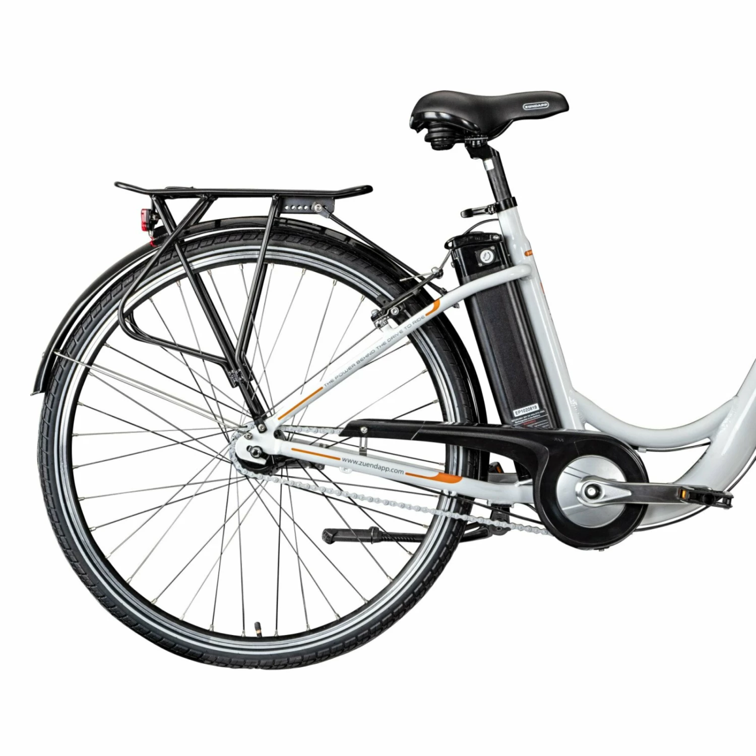 Schönes Zündapp Elektro Damenrad Z517 in Weiß und Orange mit dem Sie alle Blicke auf sich ziehen! Auf dem bequemen Citysattel lassen sich auch längere Touren bewerkstelligen. Falls Sie einmal Unterstützung benötigen, können Sie über das Ananda LCD-Steuerdisplay ganz einfach den Elektromotor zuschalten.